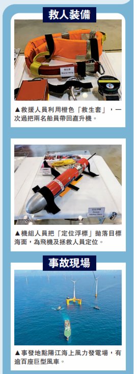 一眾救人勇士昨日向傳媒講述更多拯救經過和細節,包括展出救人裝備及工具。其中,由於沉船範圍能見度低,機組人員表示需動用「定位煙」、「定位染料」及「定位浮標」拋落目標海面,為飛機及拯救人員定位。