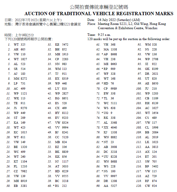 大公文匯網全媒體報道:運輸署今日(4日)宣布,傳統車輛登記號碼拍賣會於7月16日(星期六)在灣仔香港會議展覽中心舊翼L2樓S221會議室舉行。發言人表示,當日將會公開拍賣280個車輛登記號碼。已繳交一千元按金作預留登記號碼以待拍賣的申請人仍須出席拍賣會並須參與競投(包括競投第一口價,其底價為一千元),否則,所預留的登記號碼可能會以底價售予另一競投人士。