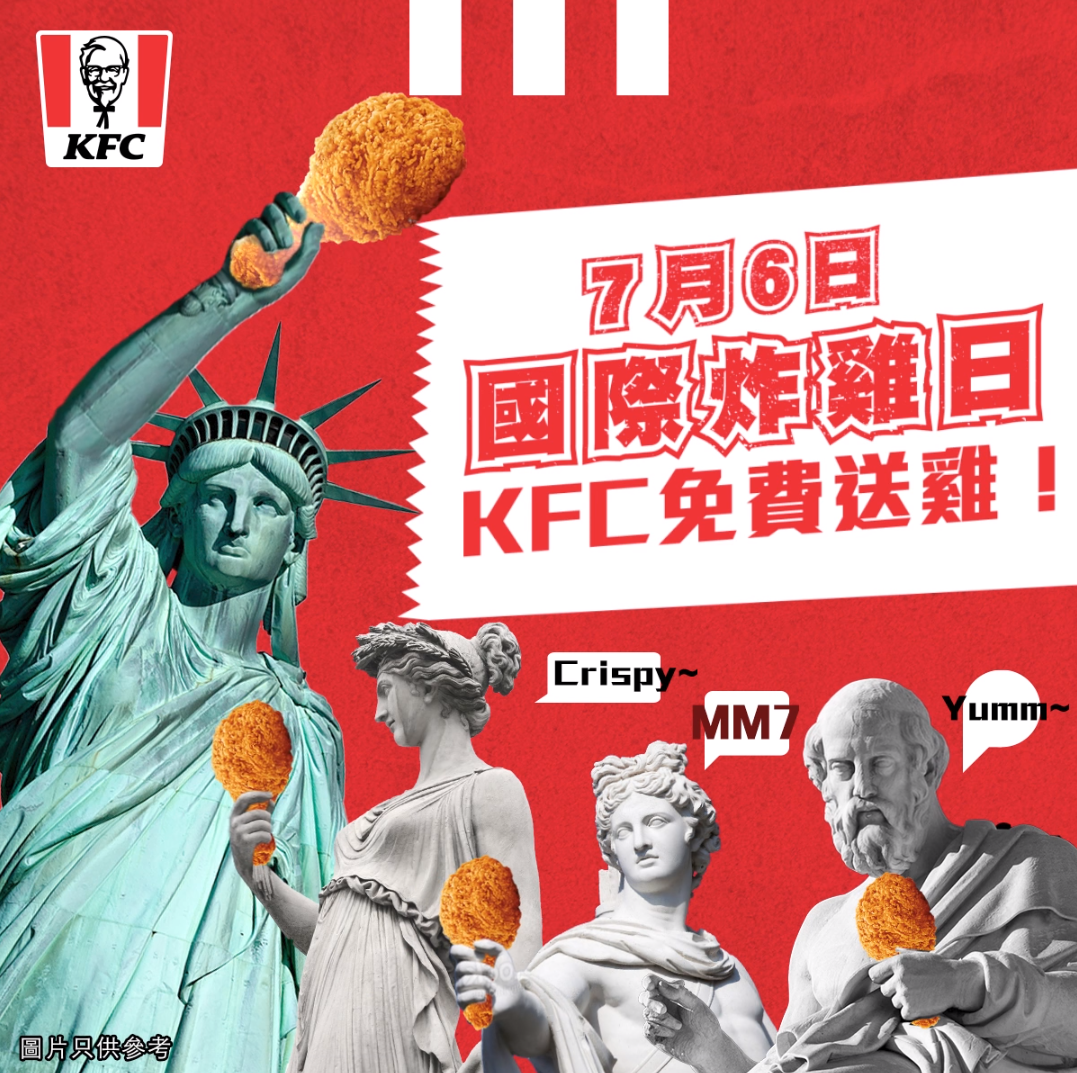 大公文匯全媒體報道,明日(7月6日)是一年一度的「國際炸雞日」,香港KFC各分店將於開店時派發100張香辣脆雞換領券,憑券即可於當日上午11時起,免費換領香辣脆雞一件,數量有限,先到先得,送完即止。