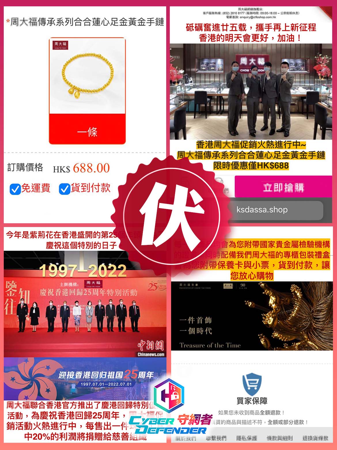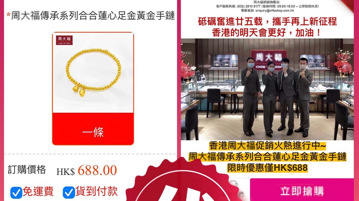 大公文匯全媒體報道,網購騙案花招百出,有謹慎市民選擇貨到付款都未必安全。警方今日(6日)在社交平台發文揭發有不法商人盜用珠寶店的標誌及相片,開設「山寨」網站和社交專頁,打着「網絡官方旗艦店」名號,以低於一折出售足金手鏈,買家貨到付款後發現「貨不對板」惟為時已晚。
