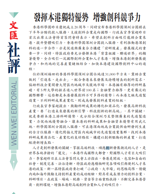 香港科學園昨日慶祝成立20周年,同時宣布香港科學園深圳分園將在下半年分階段投入服務,支援創科企業走向國際。行政長官李家超昨日首次出席立法會特首答問會時表示,希望在創科方面吸引龍頭企業來港,提升整體吸引力。香港科學園深圳分園投入服務,有利推動港深創科的進一步合作,亦是促進與廣東合力構建「前研後產」發展模式的重要一步。同時,特區政府要充分發揮本港「背靠祖國、聯通世界」的顯著優勢,全力吸引一流國際創科企業和人才來港,增強本港創新發展競爭力,和內地的完善產業鏈相結合,加快本港建設國際創科中心的進程。