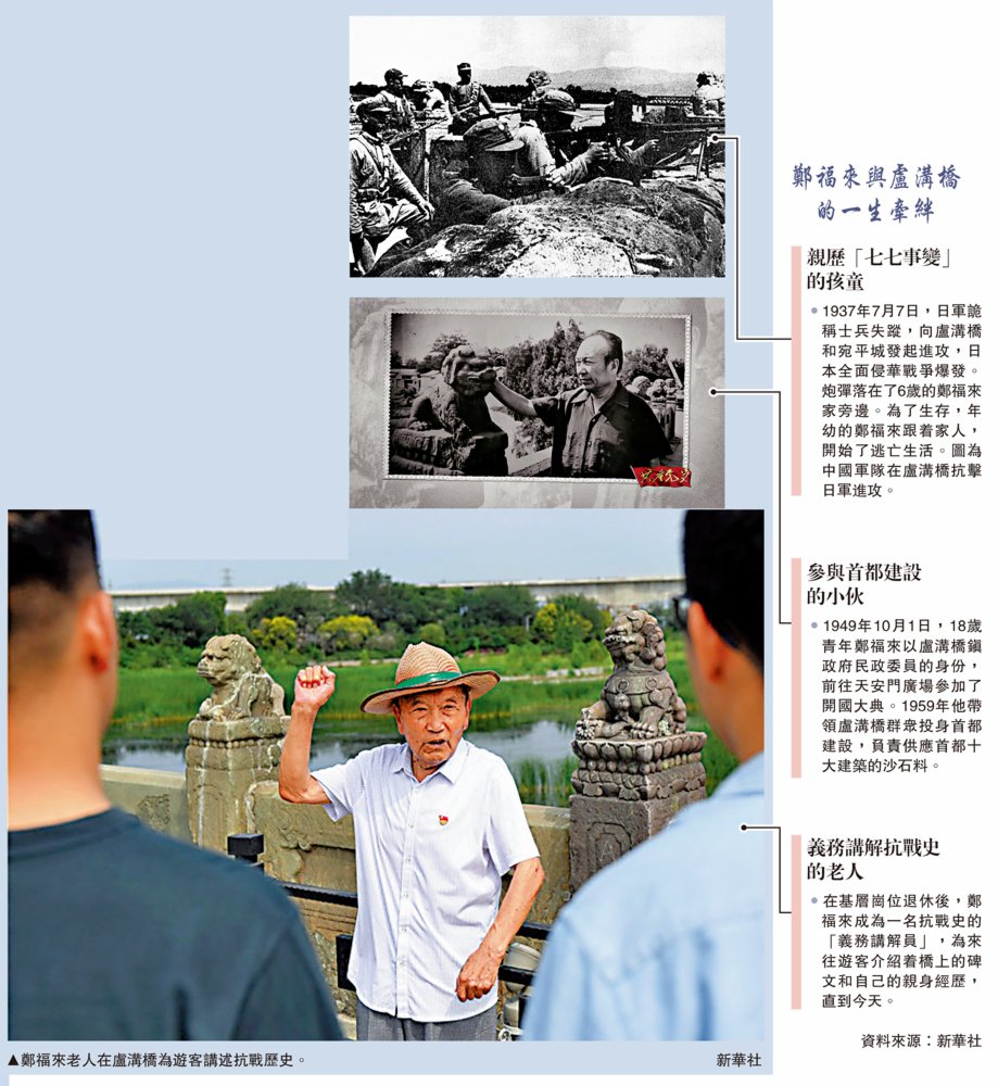 (大公報 記者 馬曉芳)1937年7月7日發生在河北省宛平縣的「七七事變」(又稱「盧溝橋事變」),拉開了中華民族全面抗戰的序幕,也是中華民族世代不能忘卻的記憶。今年7月7日是「七七事變」85周年紀念日,記者6日走訪盧溝橋和宛平城看到,城牆上日本侵略者遺留的彈坑歷歷在目,如今的宛平城居民生活祥和幸福。「不懂歷史的人沒根。」「七七事變」親歷者、91歲的鄭福來老人義務講解盧溝橋抗戰史長達七十年,他堅信歷史是最好的教科書。「只要我多活一天,就要把盧溝橋的故事多講一天。」他希望越來越多人銘記抗戰歷史,珍惜來之不易的和平。
