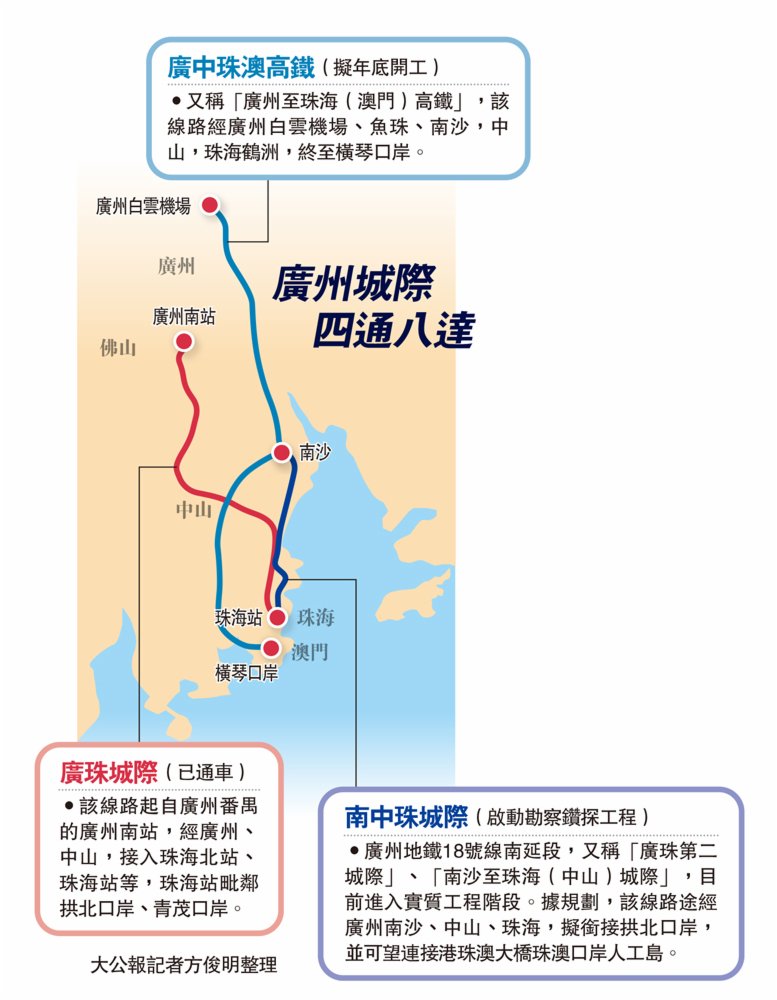 (大公報 記者 方俊明)廣州地鐵18號線南延段(又稱「南中珠城際」)近期相繼在中山段、珠海段啟動勘察鑽探工程,意味着這條繼廣珠城際之後「廣珠第二城際」進入實質工程階段。據規劃,南中珠城際總投資超103億元人民幣,途經廣州南沙、中山、珠海,擬銜接拱北口岸,並可望連接港珠澳大橋珠澳口岸人工島,促進粵港澳大灣區城市群互聯互通,助建灣區優質生活圈。有港人受訪稱,「口岸+城際+大橋」模式助港澳居民通行全國更便捷。