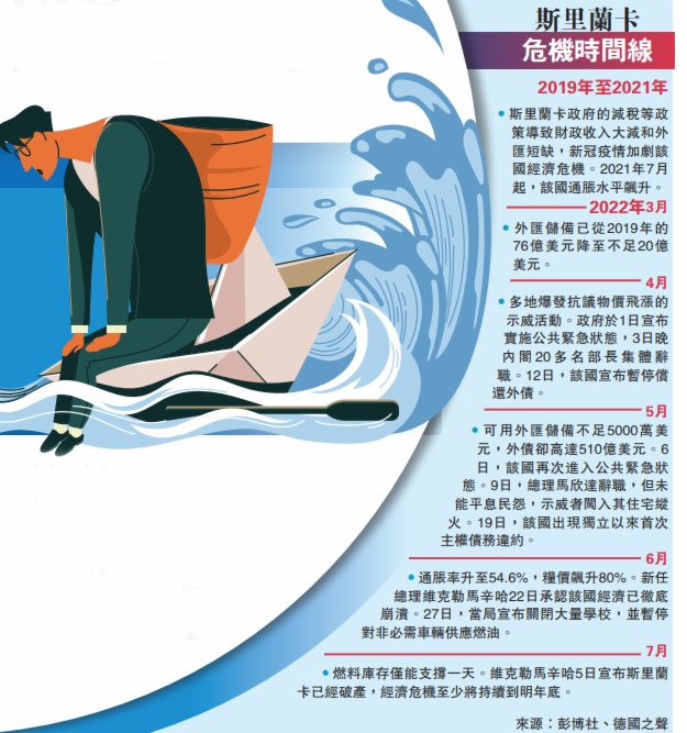 大公報綜合德國之聲、BBC、法新社報道:受本國經濟政策、新冠疫情、俄烏衝突等多重因素影響,斯里蘭卡陷入史無前例的經濟危機,已耗盡購買必需品的外匯,也無力償還超過500億美元的外債。斯里蘭卡總理維克勒馬辛哈5日承認,該國已經破產,食品、燃料和藥物等必需品嚴重短缺,且經濟危機將至少持續到2023年底。他警告說,斯里蘭卡的通脹率預計會升至60%,當局計劃停止印鈔以遏制通脹。