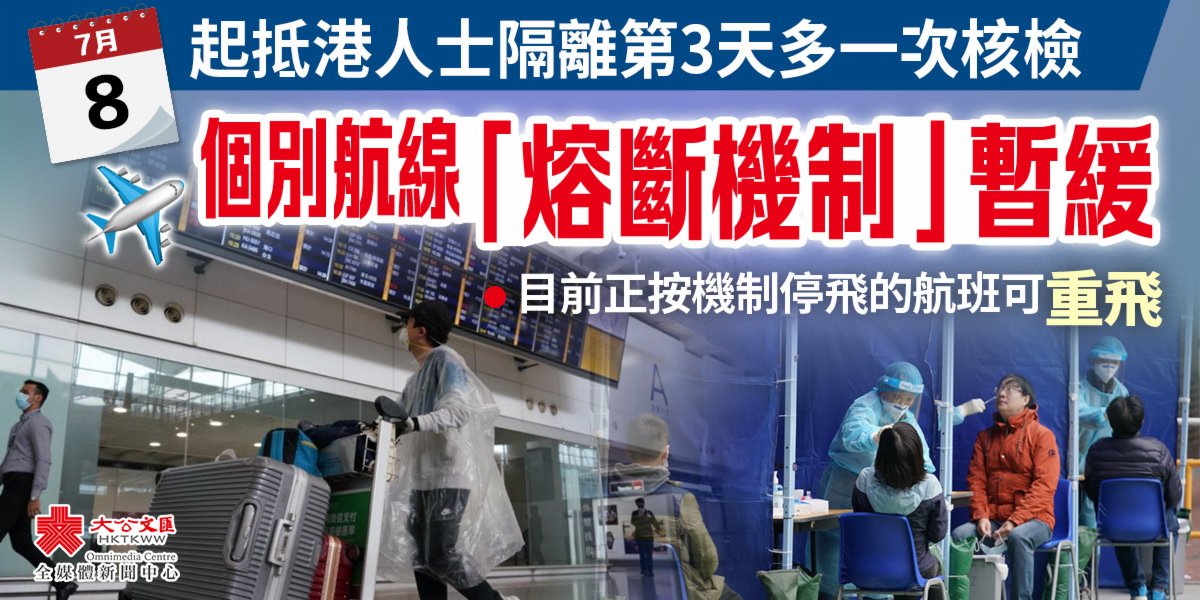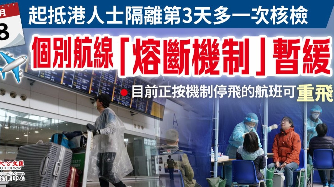 大公文匯全媒體報道:特區政府今日(7日)公布,明日起(8日)入境人員抵港第3天須進行核酸檢測,並且即日起暫緩個別航線「熔斷機制」,直至另行通告。