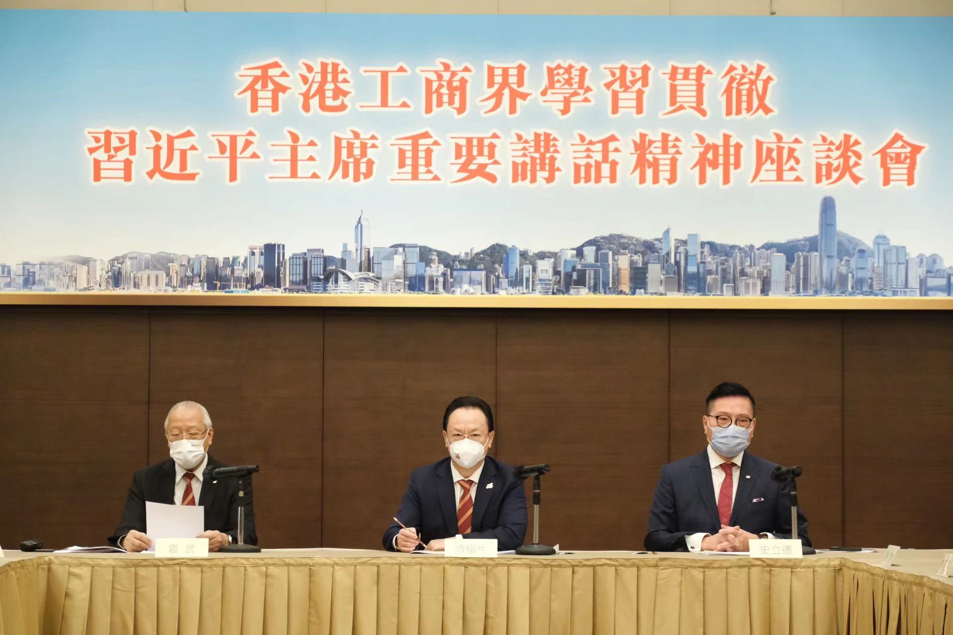 座談會上,香港中華總商會會長袁武、香港中華廠商聯合會會長史立德、全國政協常委、粵港澳大灣區企業家聯盟主席、香港中華總商會永遠名譽會長蔡冠深等9位工商業界代表依次發言,大家結合自身實際,暢談對習近平主席重要講話的理解,探索工商界如何更好融入國家發展大局,開拓更多元營商前景。