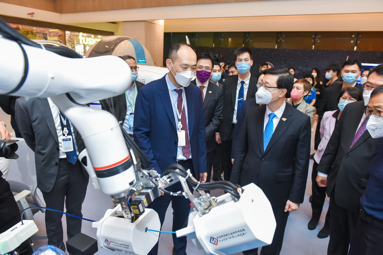 本次論壇的主辦方為中國科學院香港創新研究院人工智能與機械人創新中心(下稱:CAIR),聯合主辦方為香港科技園公司。在創新展示環節,特區行政長官李家超在中聯辦副主任譚鐵牛等陪同下,參觀了CAIR執行副主任劉宏斌主持研發的「MicroNeuro顱內微創手術機械人系統」。相比於當前技術水平,該系統能夠在大幅減小對腦組織的創傷下,更安全快速地完成顱內深部的病變治療。該系統在柔性手術器械觸覺感知技術及精準運動控制等方面引領世界前沿。
