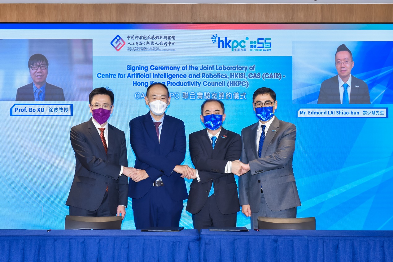 論壇上,中國科學院香港創新研究院人工智能與機械人創新中心–香港生產力促進局聯合實驗室(CAIR-HKPC聯合實驗室)正式宣布成立。香港創新科技及工業局局長孫東,CAIR主任、中科院自動化所所長徐波,CAIR執行副主任劉宏斌,香港生產力局總裁畢堅文,首席數碼總監黎少斌和機械人及人工智能部總經理葛明等共同出席簽約儀式。劉宏斌與葛明代表雙方簽署了合作協議。