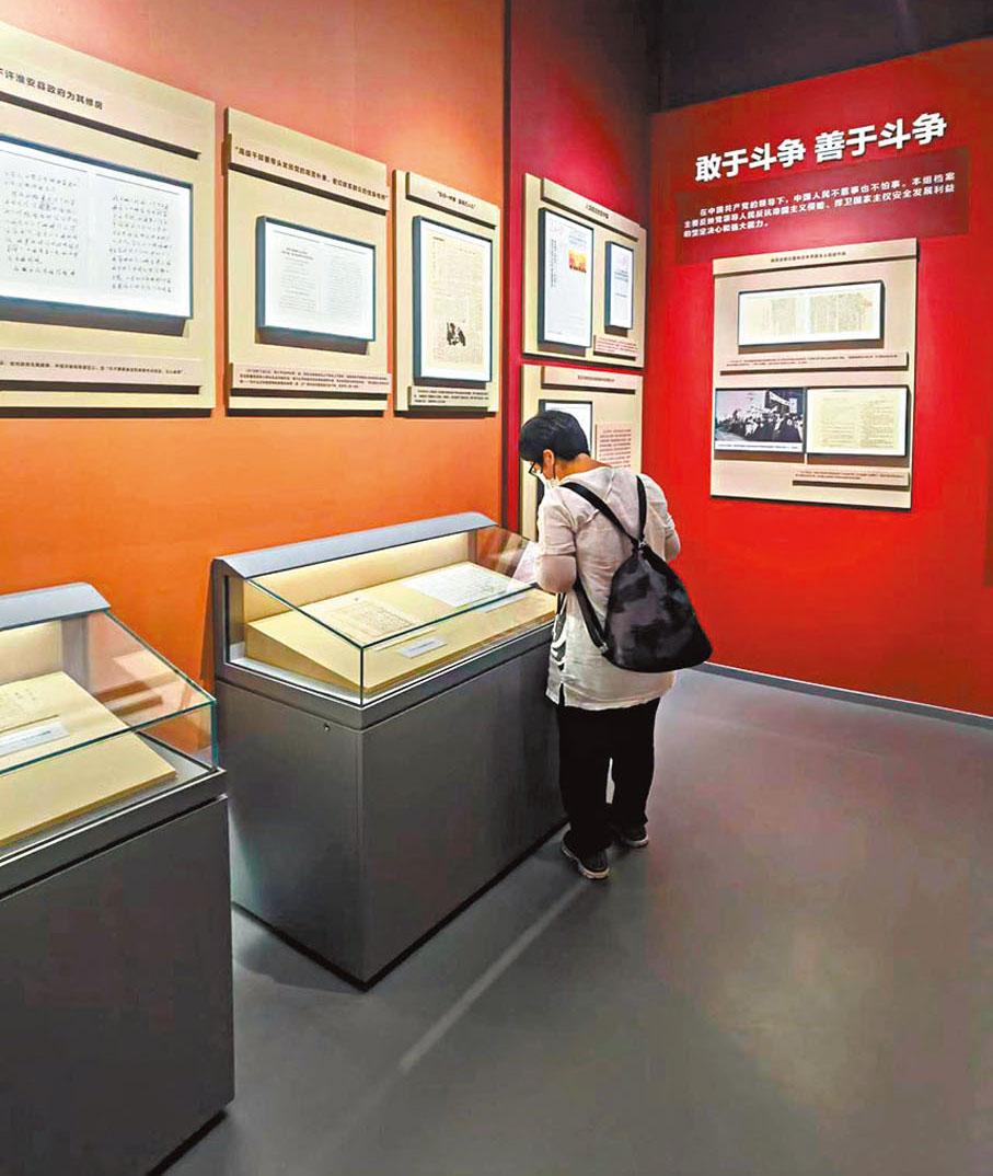 此次展覽中,在「鬥爭的力量」部分,一組題為「敢於鬥爭、善於鬥爭」的檔案備受關注。抗日戰爭、抗美援朝戰爭的珍貴史料一一呈現,毛澤東撰寫的《丟掉幻想、準備戰鬥》等名篇悉數展出,中共多位領導人關於戰爭與和平的論述振聾發聵,中華民族反抗強權、保家衛國的不屈風骨穿越時空,展示了在中國共產黨領導下,中國人民不惹事也不怕事的精神風骨,體現了黨領導人民反抗帝國主義侵略、捍衛國家主權安全發展利益的堅定決心和強大能力。