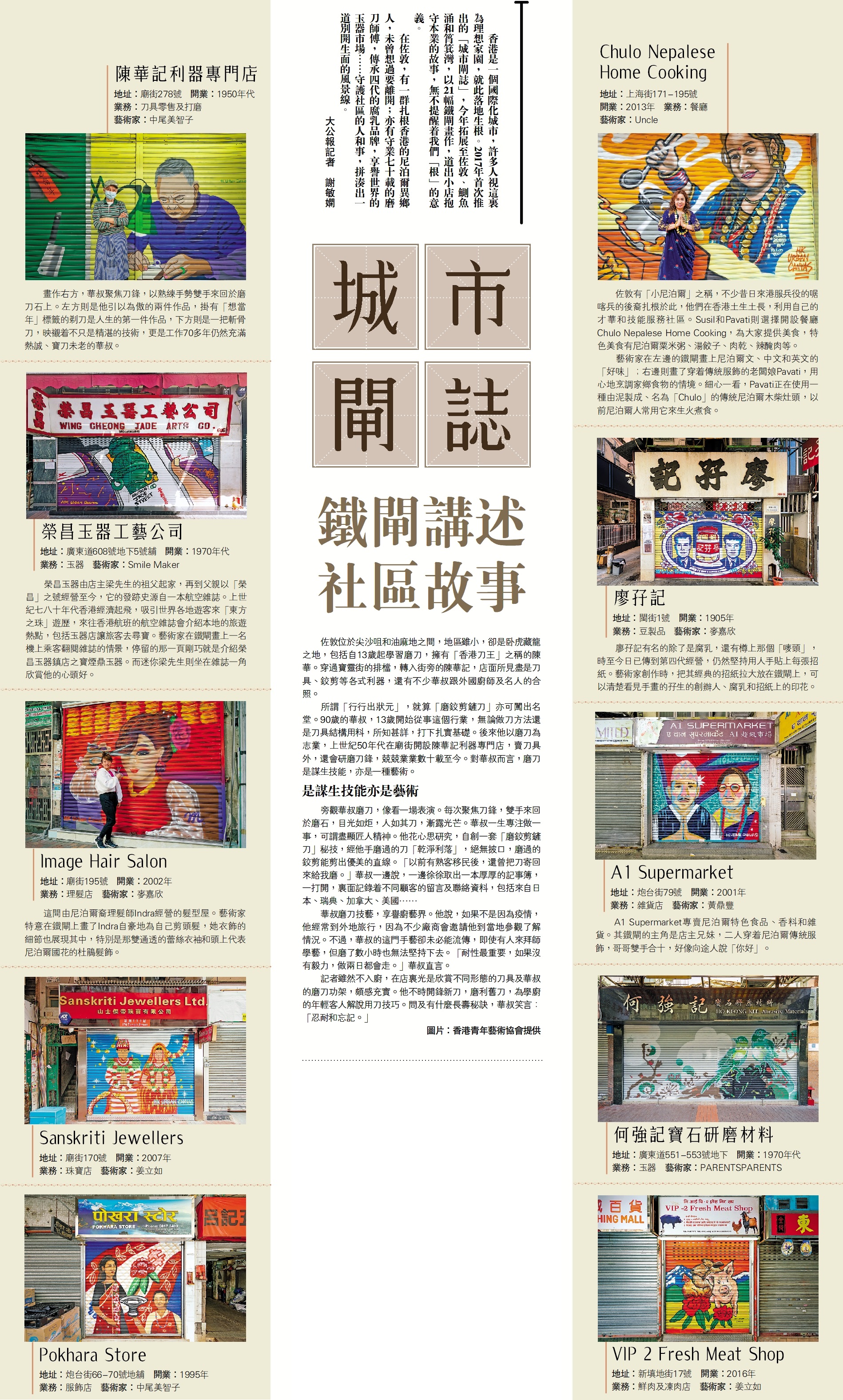 (大公報 記者 謝敏嫻)香港是一個國際化城市,許多人視這裏為理想家園,就此落地生根。2017年首次推出的「城市閘誌」,今年拓展至佐敦、鰂魚涌和筲箕灣,以21幅鐵閘畫作,道出小店抱守本業的故事,無不提醒着我們「根」的意義。