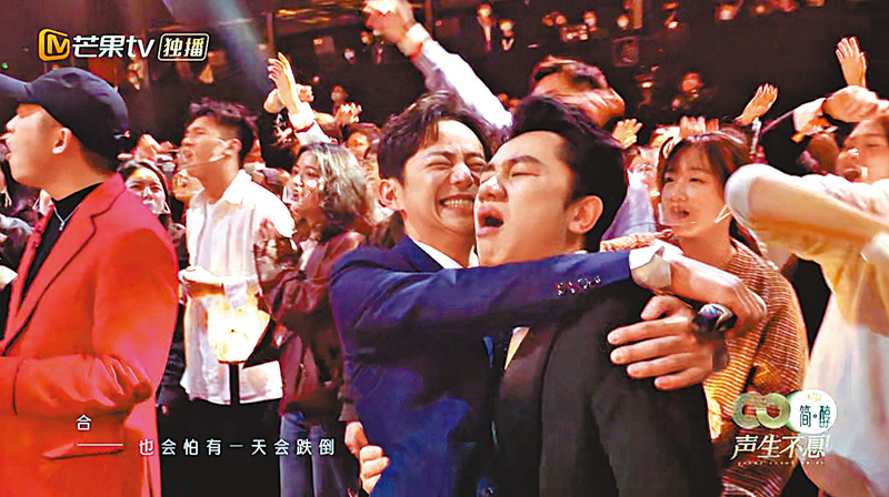 節目首期,洪嘯就下了一味猛藥,大合唱選擇了《海闊天空》,歌曲的前奏一響起,葉蒨文唱響第一句時,畫面掃過台下觀眾和台上歌手,不少人都自覺地跟唱、揮手。尤其是現場突然切入Beyond樂隊在1991年香港紅館舉辦的《生命接觸演唱會》的音像畫面時,黃家駒的聲音穿透而來,令不少人瞬間紅了眼眶。作為節目主持人何炅和金曲推薦官的王祖藍亦不例外,動情之處,他們自然而然牽舉起對方的手緊緊握在一起。