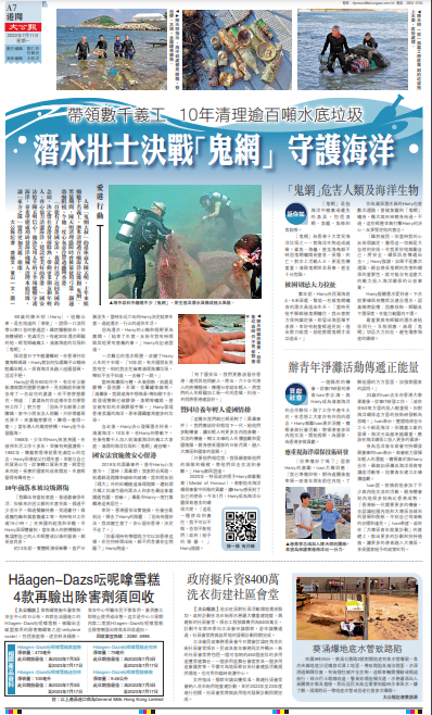 自此後,Harry決心發揮潛水所長,清潔海洋。10年來,在Harry的帶動下,先後有數千人加入到清潔海洋的義工大家庭,清理的海洋垃圾和「鬼網」逾百噸。