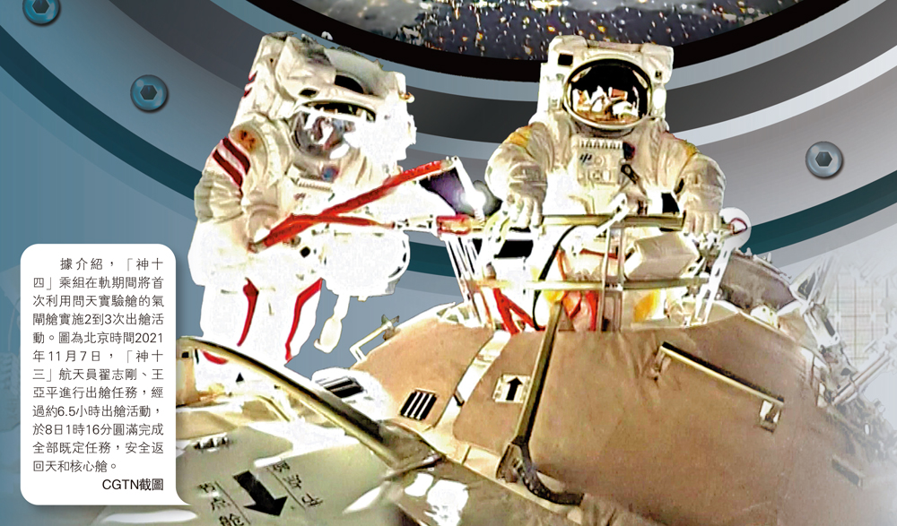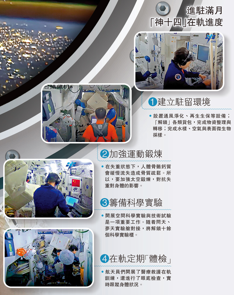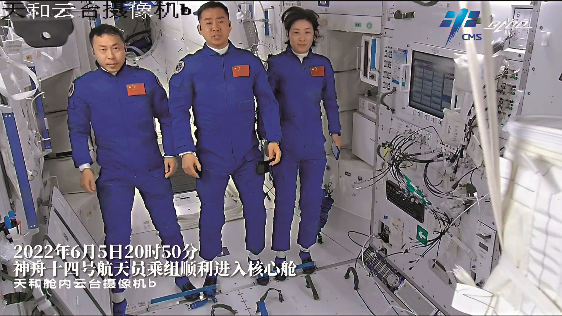 自6月5日神舟十四號航天員乘組陳冬、劉洋、蔡旭哲乘坐載人飛船從酒泉出發抵達中國空間站,在軌飛行至今已一個多月。日前,神舟十四號乘組在空間站,通過天地通信模式接受大公報記者專訪,表示「我們很快適應了太空環境,在這一個月裏,我們先後完成了物資轉移和整理、載人環境建立、艙內設備安裝和調試等工作,還進行了在軌專業性訓練,在空間站工作是累並快樂着」,神舟十四號乘組表示,「太空出艙即將到來,問天和夢天兩大實驗艙交會對接隨後展開。有偉大祖國和全國人民的鼎力支持,有地面團隊的全力保障,我們對迎接挑戰充滿信心。」