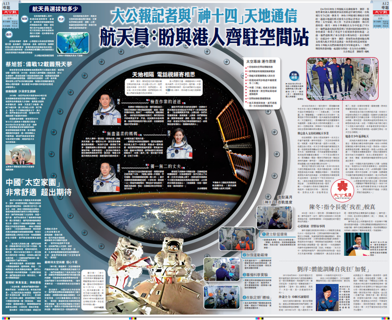 【大公報記者 劉凝哲、楊帆】自6月5日神舟十四號航天員乘組陳冬、劉洋、蔡旭哲乘坐載人飛船從酒泉出發抵達中國空間站,在軌飛行至今已經一個多月。神舟十四號飛行乘組在空間站,通過天地通信模式接受大公報記者專訪,講述他們在「太空家園」的工作、生活及全新感悟。執行任務的第一個月,神舟十四乘組在太空中度過了7月1日,他們通過電視新聞看到了香港回歸祖國25周年大會的盛景,收看了習近平主席視察香港的報道。之前,他們還收到了來自香港小朋友的信,並在軌回信。在採訪中,陳冬、劉洋、蔡旭哲向香港同胞長期支持載人航天事業表達謝意,向香港市民送來祝福。神舟十四航天員們鼓勵香港青少年做追夢人:「我們期待與香港同胞一起進駐空間站,在太空自由翱翔」。