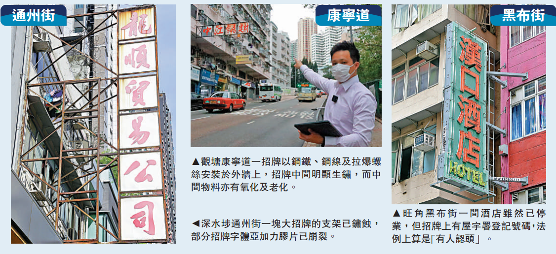 註冊專業測量師(建築測量)劉啟勁,實地察看這些招牌後向記者表示,「龍豐獎品旗幟店」招牌以鋼鐵作主體支撐,並以鋼線及拉爆螺絲繫穩大廈外牆上,「雖然招牌整體未有出現變形,但主體已經嚴重鏽蝕,將會有危險甚至倒塌的風險。」