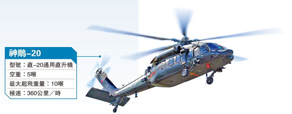 10噸級的「神鵰-20」即直-20,對標美軍「黑鷹」直升機,尤其擁有卓越的高原飛行性能。已經廣泛列裝了陸軍、海軍、空軍、火箭軍、武警等各軍兵種,擁有了陸航突擊型、艦載火力突擊型、艦載反潛型等不同型號。