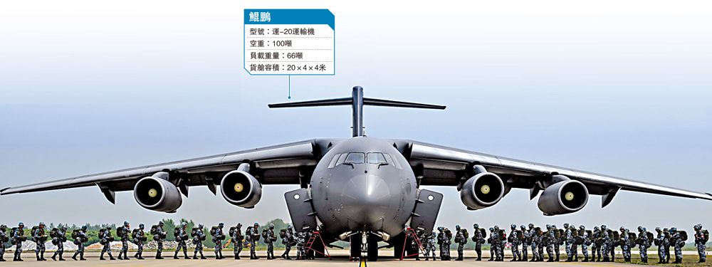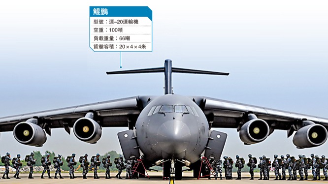 運-20最大起飛重量超過220噸,最大載重量達66噸,大幅提升了解放軍的遠程機動能力和戰略投送能力,可以用於大兵團的批量遠程投送、空降,以及將重型武器裝備部署到前沿戰場。