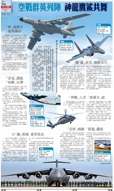 「雷神」「戰神」轟炸機,「鯤鵬」「鴻鵬」運輸機,「威龍」「潛龍」「飛鯊」戰鬥機,「千里眼」預警機,「雷電」電子通信對抗機,「海雕」反潛巡邏機,「獵鷹」「山鷹」教練機,「神鵰」「霹靂火」直升機,「翼龍」「雲影」無人機……翱翔高天,飛馳海空,為航母戰鬥群、空射導彈、大兵團空降、兩棲登陸、空中強火力突擊、反潛獵潛、電磁攻防等新質作戰力量,提供了堅實支撐。