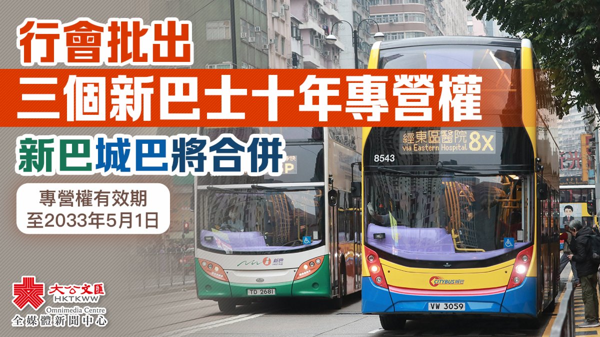 大公文匯全媒體報道,行政會議今日(12日)決定批出三個新巴士十年的專營權,均由明年5月1日開始生效,有效期至2033年5月1日,包括龍運、城巴及新巴,其中城巴及新巴將會合併。