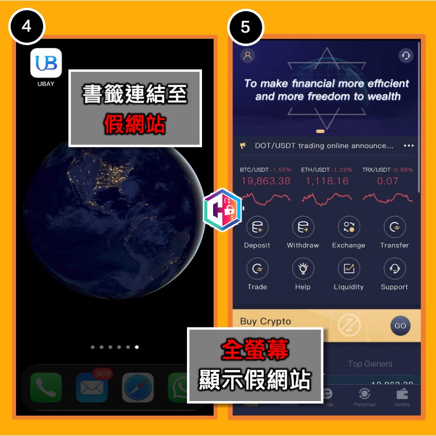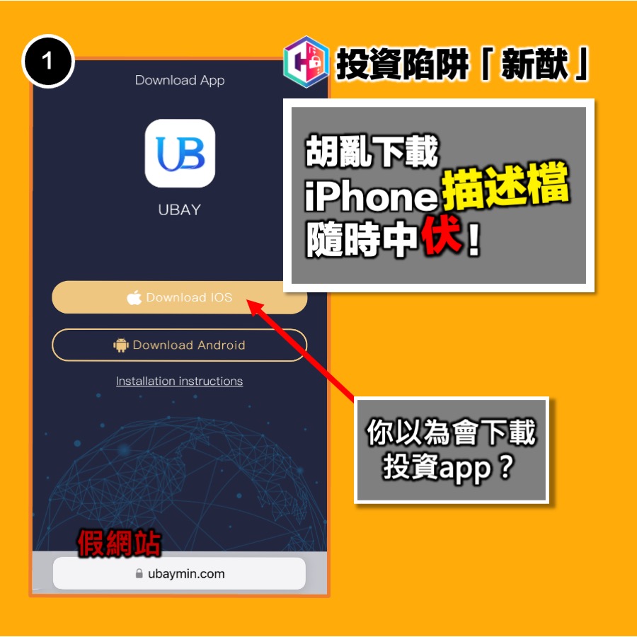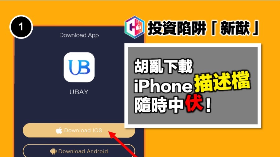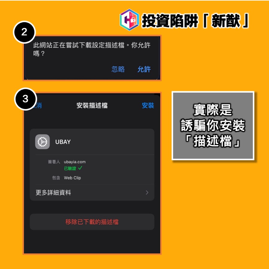 警方指出,最近發現有投資騙徒透過惡意iOS描述檔 (Configuration Profile) 行騙。騙徒在假網站設置下載手機App的連結,實質上誘騙用戶下載惡意iOS描述檔。安裝描述檔後,用戶手機主畫面便會新增一個書籤,投資者按下書籤隨即會以全屏方式進入假網站。由於書籤和App的圖像顯示並無分別,假網站的界面與一般投資App的設計也頗相近,因此投資者可能會誤以為在官方渠道安裝了真正的手機App,因而減低戒心,並一步一步墮入騙局。