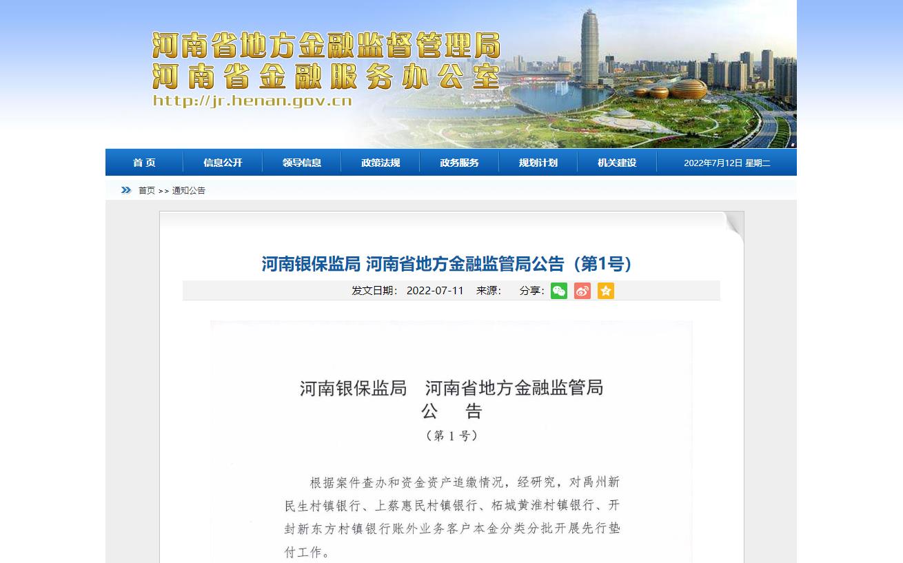 1日,河南省地方金融監督管理局官網發布的消息顯示,河南銀保監局、河南省地方金融監管局有關負責同志表示,鑒於河南省禹州新民生等4家村鎮銀行案件偵辦取得重大進展,有關部門正在甄別信息,研究制定處置方案。提醒相關客戶通過線上程序抓緊登記,如實登記。該局官網10日晚間發布公告稱,河南銀保監局、河南省地方金融監管局有關負責人表示,為維護廣大群眾合法權益,有關部門正在加快核實4家村鎮銀行客戶資金信息,制定處置方案,將於近期公布。再次提醒相關客戶盡快完成登記。