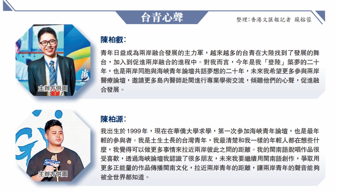 「如今,大陸對青年人事業發展前所未有的支持,讓我們這些台灣青年身處最好的時代。我希望更多台灣青年能夠把握這樣的好機遇,走進這裏,融入這裏,實現價值,並最終收穫成長,在這片熱土上實現從0到1的夢想,遇見更美好的未來。」剛從華僑大學畢業的台青彭筠婷,作為廈門湖里區殿前街道興隆社區台胞志願者,在此間第十四屆海峽論壇之海峽兩岸社區治理論壇上,分享了自己和家人走出家門融入社區,服務他人,收穫美好的成長故事。