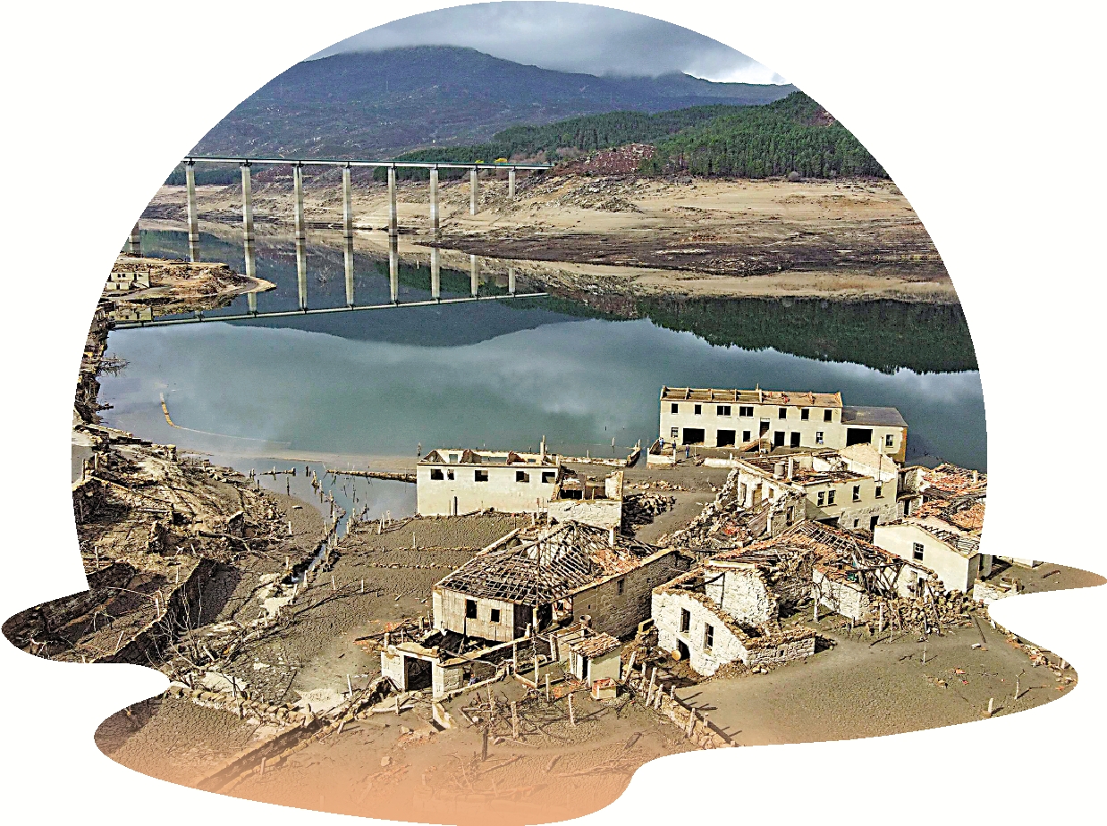 今年2月,西班牙因持續乾旱導致水庫乾涸,位於西班牙與葡萄牙邊界處的村莊阿塞雷多重見天日。阿塞雷多村於1992年被水淹沒,廢墟中清晰可見倒塌的房屋、鏽跡斑斑的汽車零件及生鏽的飲水機。