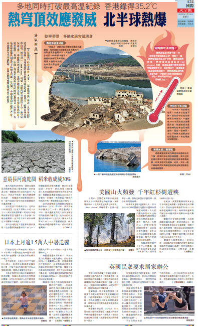 【大公報綜合美聯社、CNA、《華盛頓郵報》報道】北半球同時遭遇熱浪侵襲,多地接連打破當地最高溫度紀錄,從北美,歐洲再到亞洲都出現「熱穹頂」(heat dome)現象,也即高壓長期滯留上空,熱空氣無法上升,導致地表愈來愈熱。美國多地高溫不退,專家預計更熱的日子還在後頭。英國、法國、葡萄牙及西班牙等歐洲國家遭遇又一波熱浪,有地區錄得攝氏44度以上的驚人高溫。在亞洲,中國香港12日錄得35.2度,再次刷新今年高溫紀錄,日韓等地則頻頻出現熱死人的情況。