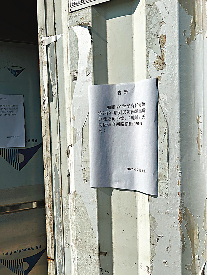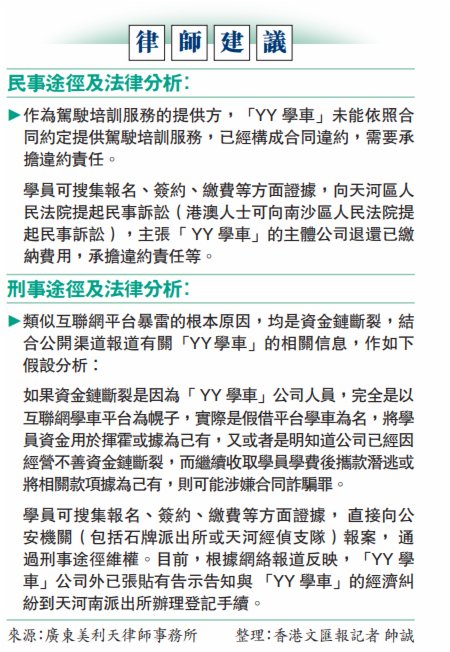 (香港文匯報 記者 帥誠)香港文匯報記者連日來接到多位在內地就讀的港澳籍大學生爆料,反映當地駕校平台「YY 學車」在廣州的多個分校、練車場已經關閉,同時該公司位於廣州天河區天河南二路的總部也已「人去樓空」,使眾多學員無法繼續學車課程,也無法獲得退款。香港工聯會廣州服務中心向香港文匯報記者證實,已接獲涉此事件的179名港澳台學生的求助維權信息,其中港生高達86人。目前不少學生已向當地派出所報案,工聯會顧問律師則建議求助者保留好合同、繳費紀錄、聊天紀錄等證據用於訴訟。有練車場外亦張貼有告示要求學員向警方辦理登記。