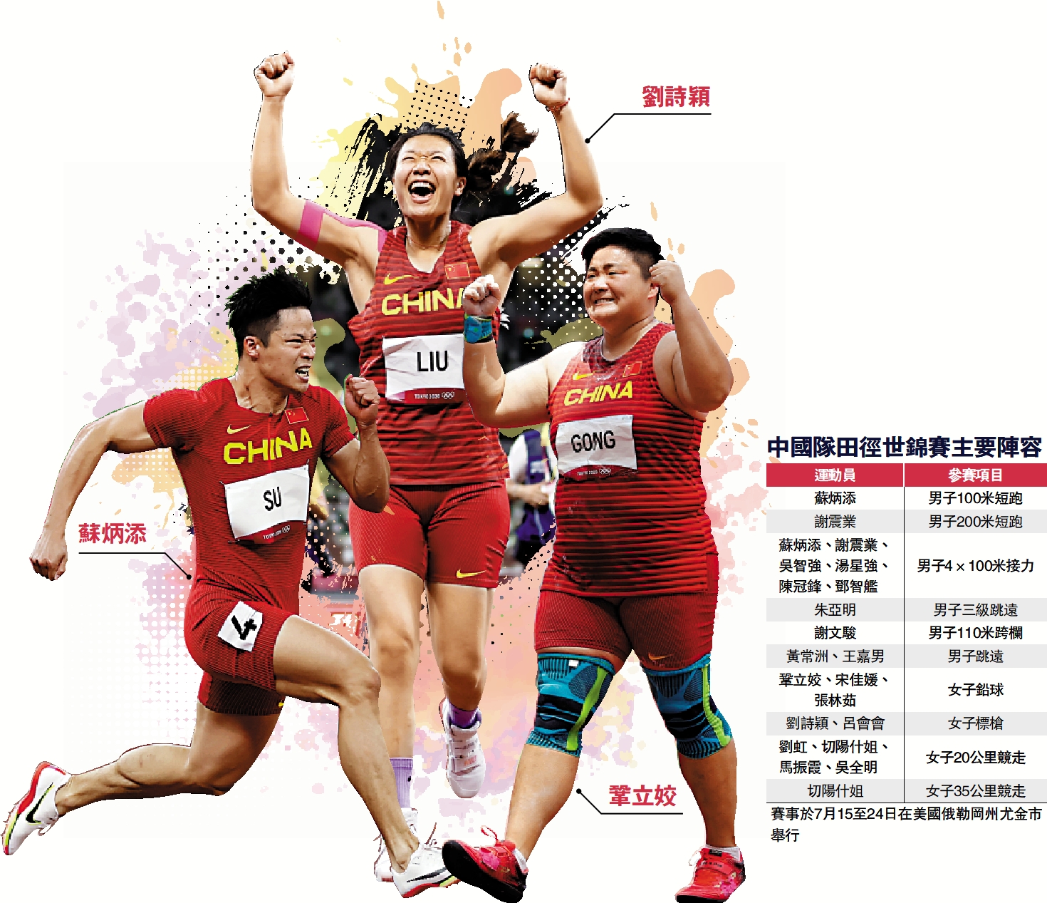 據大公報援引新華社報道,因新冠疫情推遲一年舉行的世界田徑錦標賽將於7月15日在美國尤金開幕,比賽至7月24日煞科。中國隊參賽人員已經陸續抵達,東京奧運會女子標槍冠軍劉詩穎表示,希望能在世錦賽上有新突破。