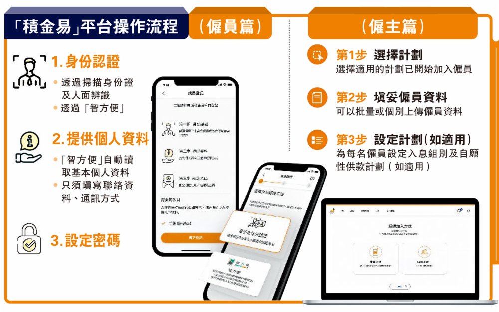 積金易平台作為一個中央和綜合的電子平台,將把強積金計劃的行政工作程序標準化、精簡化和自動化,從而提高強積金制度的運作效率、降低行政成本和改善用戶體驗。為推廣積金易平台項目,積金局於2021年3月成立全資附屬的積金易平台公司,負責設計、構建和營運積金易平台。