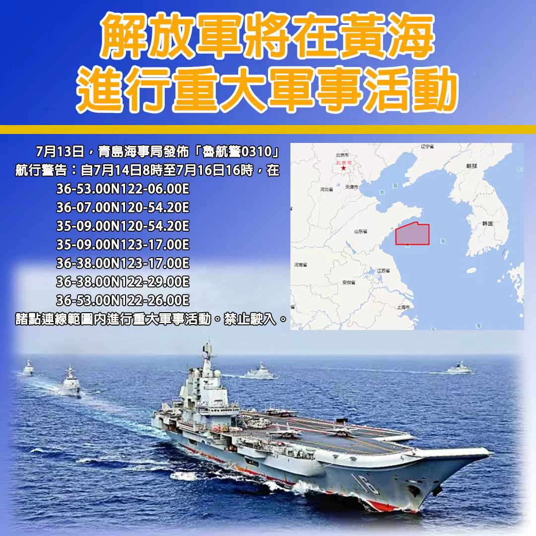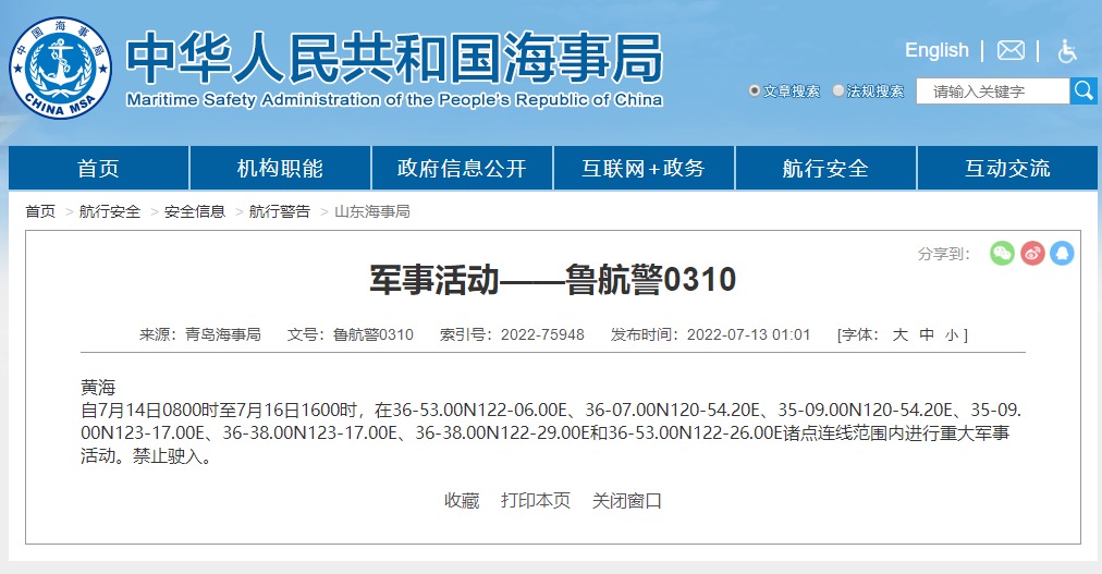 7月13日,青島海事局發布「魯航警0310」航行警告:自7月14日8時至7月16日16時,在