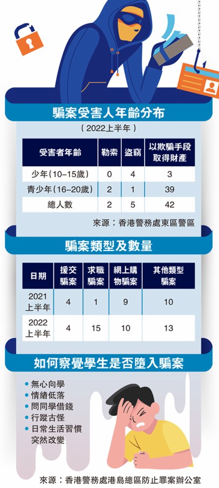 鄺子銳又指,2022年上半年主要涉及青少年受害者的案件類型包括勒索、盜竊和以欺騙手段取得財產等。當中,被他人欺騙而損失錢財的10至20歲受害者則高達42名,較去年有明顯上升。從欺騙手段細分,求職騙案由去年的1宗增至15宗,其次為網上購物騙案及援交騙案,各發現10宗和4宗。