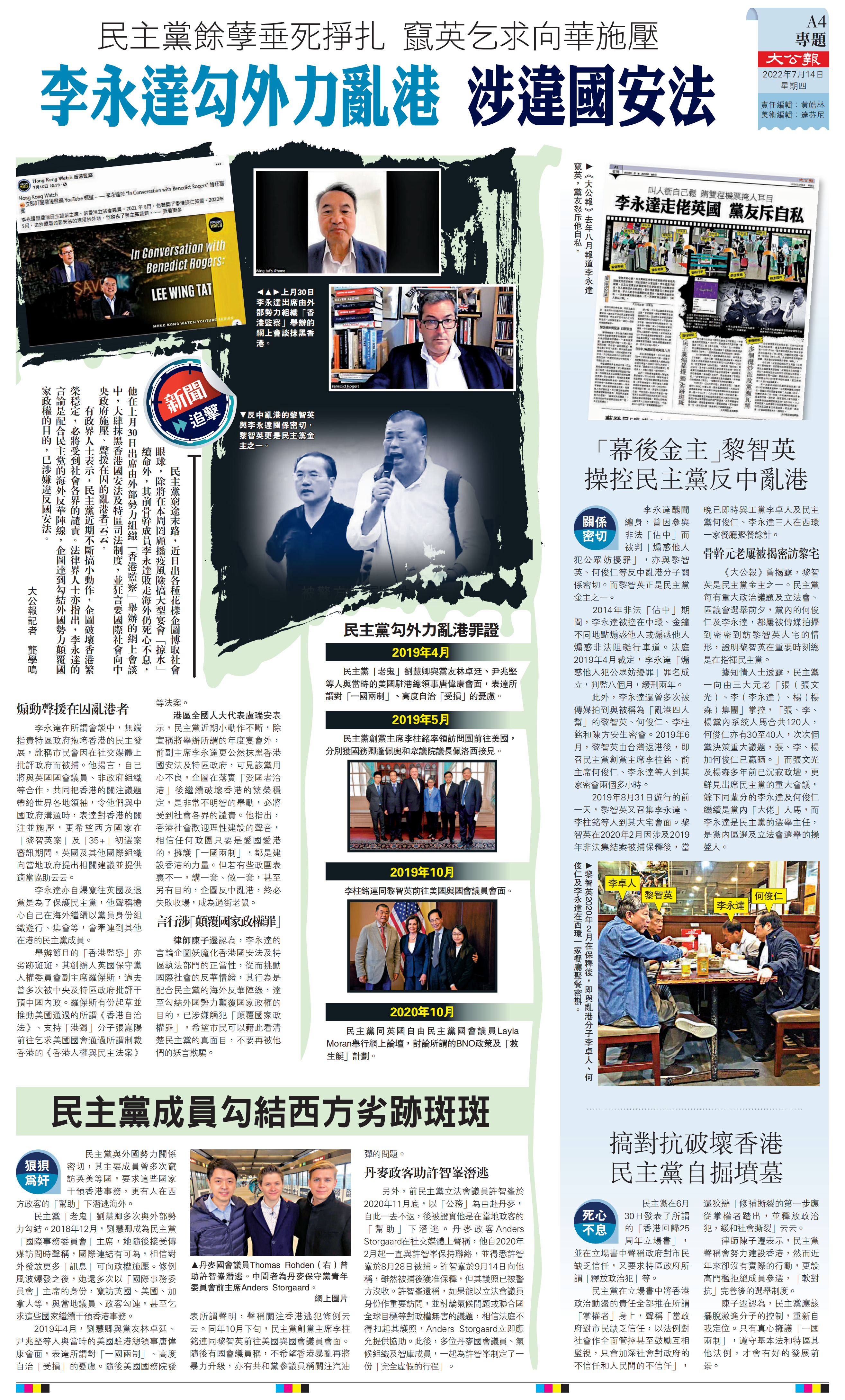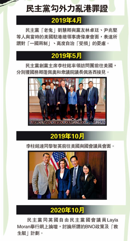 民主黨與外國勢力關係密切,其主要成員曾多次竄訪英美等國,要求這些國家干預香港事務,更有人在西方政客的「幫助」下潛逃海外。
