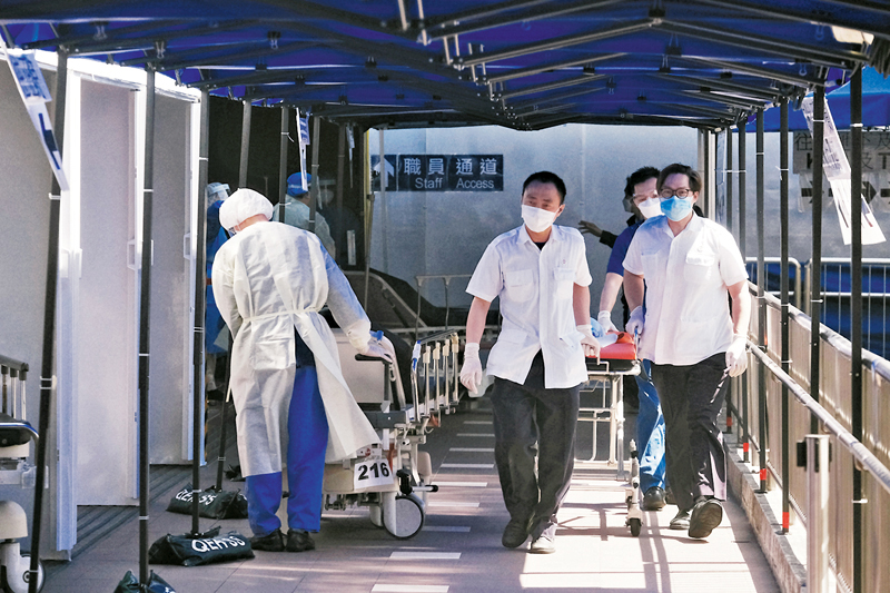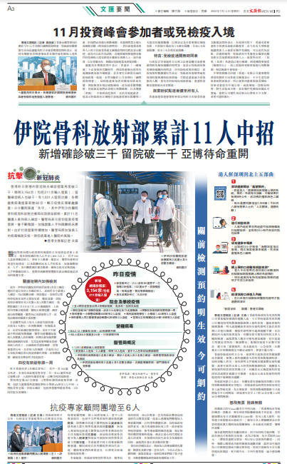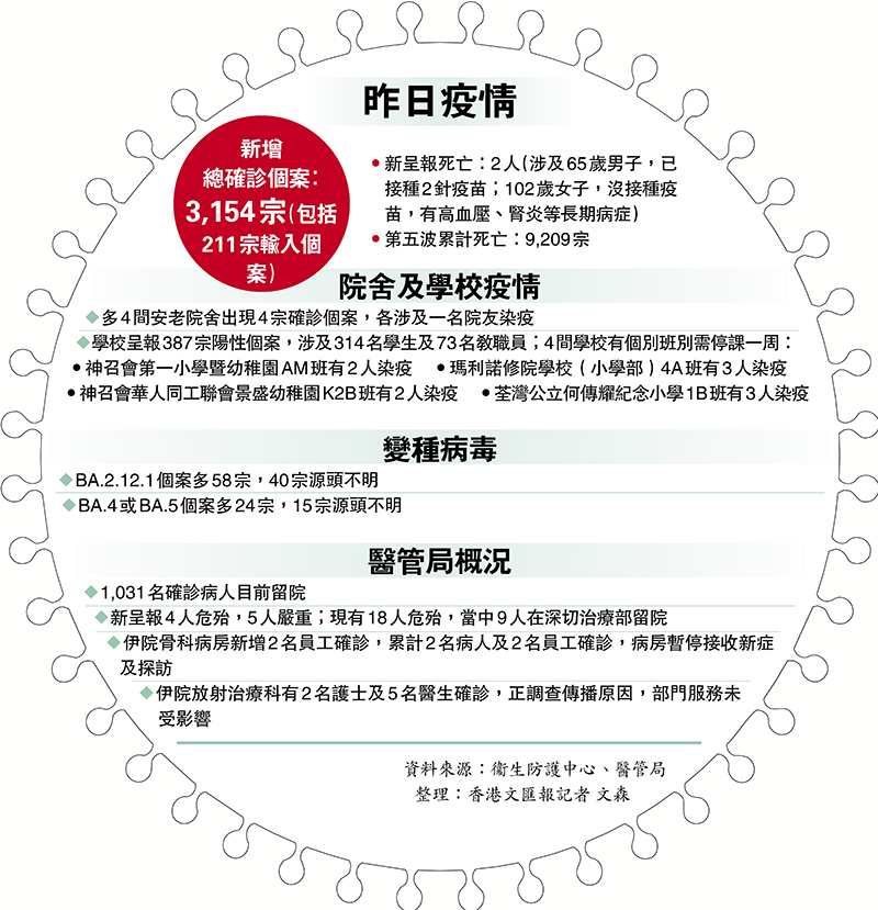 【香港文匯報記者 文森】香港昨日新增的新冠肺炎確診個案再度破三千,錄得3,154宗(包括211宗輸入個案);留醫確診病人也破千,有1,031人留院治療;各類變異病毒個案新增82宗,顯示疫情反彈漸趨嚴重。公立醫院接連「失守」,其中伊利沙伯醫院骨科病房和放射治療部出現感染群組,累計11名醫護人員和病人確診。醫管局表示密切留意疫情發展,會不斷微調、加強調集人手和隔離病床應對。由於社區個案持續增加,醫管局將加強員工的病毒檢測安排,降低病毒進入醫院的風險。