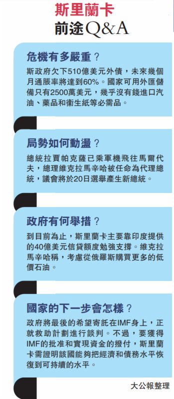 大公報綜合美聯社、《華爾街日報》、CNN報道:斯里蘭卡國內亂局持續,已經辭職的總統拉賈帕克薩13日乘軍機飛往馬爾代夫,該國議會隨後任命總理維克拉馬辛哈為代理總統。維克拉馬辛哈當天下令在全國實施緊急狀態,數小時後又宣布取消。數千名示威者13日包圍並衝入總理辦公室,警方一度發射催淚彈驅趕人群,至少30人受傷。