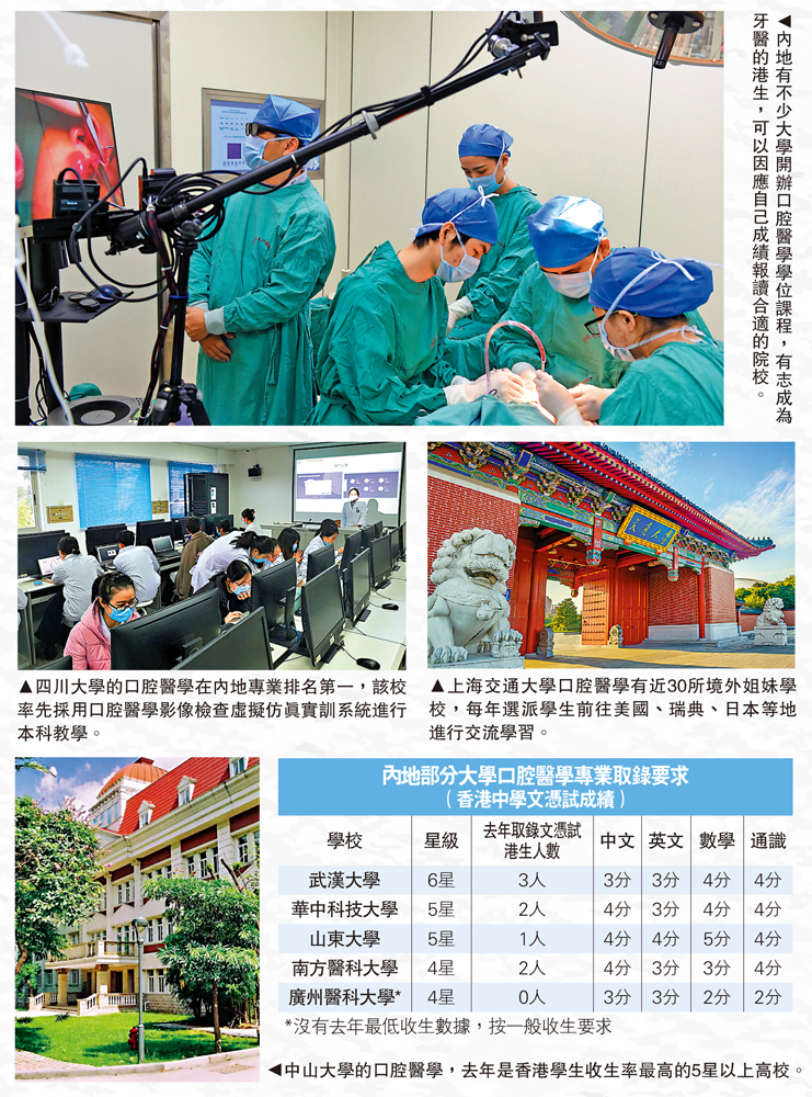 本港現時只有香港大學開辦牙醫學士課程,競爭激烈,有志成為註冊牙醫的同學,可考慮到內地修讀口腔醫學。內地有多所高校均有開辦口腔醫學專業,大公報記者今期揀選介紹三間有參與香港文憑試招生計劃的學府,讓有志成為牙醫的同學們作參考
