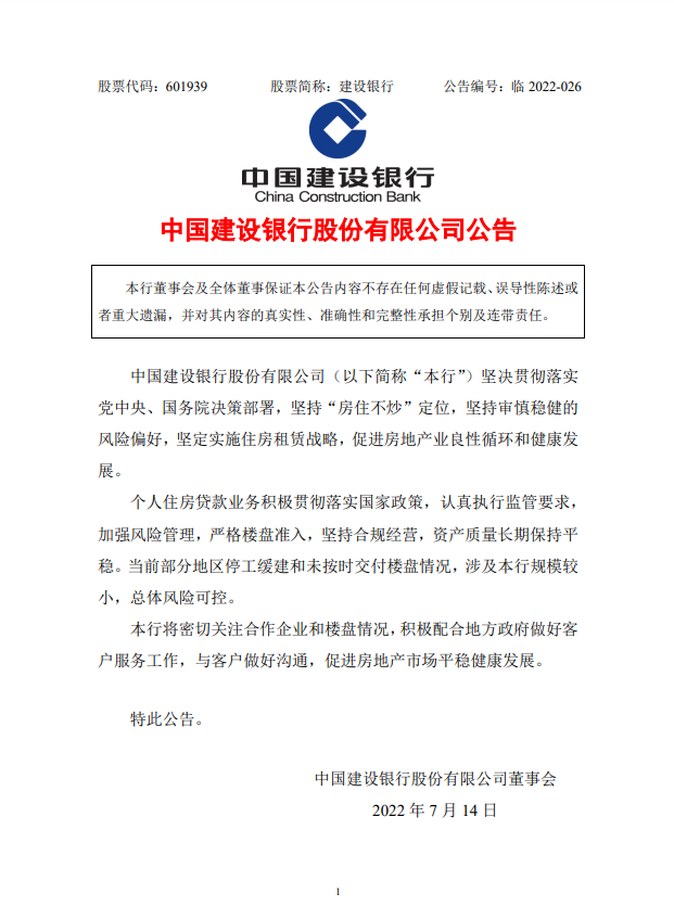中國建設銀行發布公告指,當前部分地區停工緩建和未按時交付樓盤情況,涉及本行規模較小,總體風險可控。