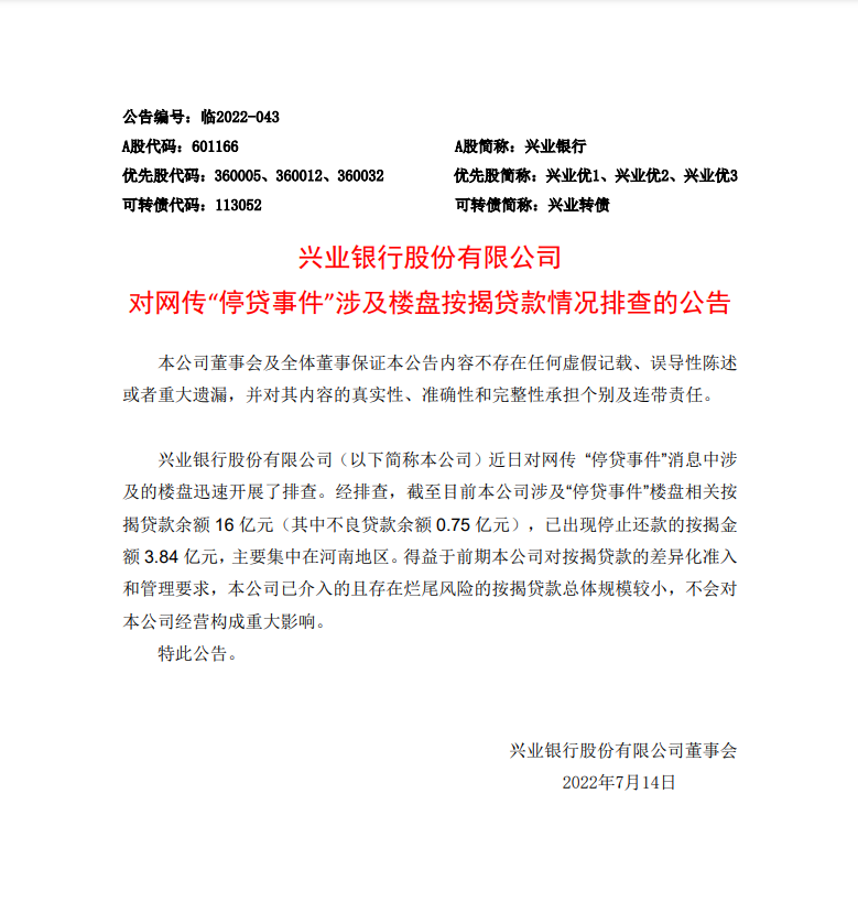 興業銀行發布公告指,截至目前公司涉及「停貸事件」樓盤相關按揭貸款餘額16億元(其中不良貸款餘額0.75億元),已出現停止還款的按揭金額3.84億元,主要集中在河南地區。得益於前期公司對按揭貸款的差異化准入和管理要求,公司已介入的且存在爛尾風險的按揭貸款總體規模較小,不會對公司經營構成重大影響。