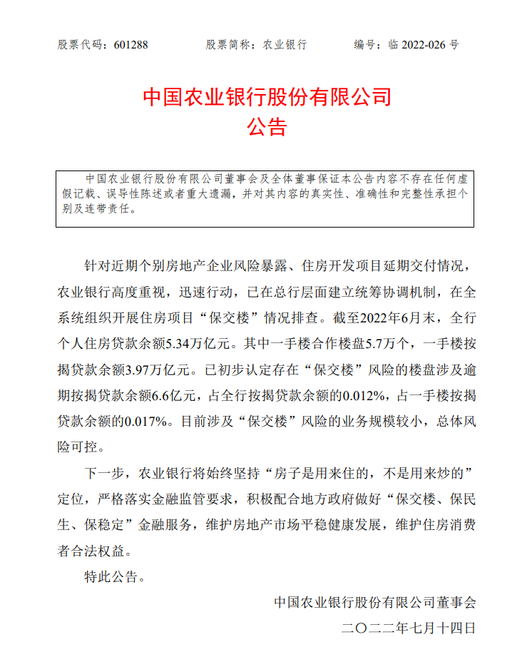 中國農業銀行發布公告指,截至2022年6月末,全行個人住房貸款餘額5.34萬億元(人民幣,下同)。其中一手樓合作樓盤5.7萬個,一手樓按揭貸款餘額3.97萬億元。已初步認定存在「保交樓」風險的樓盤涉及逾期按揭貸款餘額6.6億元,佔全行按揭貸款餘額的0.012%,佔一手樓按揭貸款餘額的0.017%。目前涉及「保交樓」風險的業務規模較小,總體風險可控。
