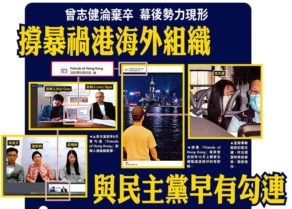 「Friends of Hong Kong」與民主黨勾連,裏應外合分化香港社會,又鼓吹攬炒及支持暴徒,「Friends of Hong Kong」的專頁在2020年12月25日上載曾志健隔海望灣仔的背部照,拍照日期正是曾志健缺席出庭聆訊後的日子,曾志健當時已被法庭發出通緝令,開始過着匿藏、不能見光的生活。