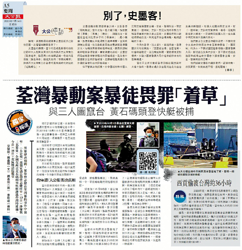 (大公報記者 施文達、周揚<文> 李斯達<資料> 周亮恒<圖>)《大公報》昨日獨家報道荃灣黑暴襲警暴徒曾志健等四名通緝犯,前往西貢黃石碼頭準備坐快艇竄逃台灣,途中被警方拘捕。昨日,國安處高級警司李桂華介紹案情時,透露四人匿藏一年來過着非人生活,直斥背後的海外組織食「人血饅頭」,國安處正展開調查。