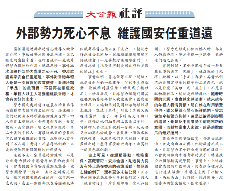 大公報社評|外部勢力死心不息 維護國安任重道遠