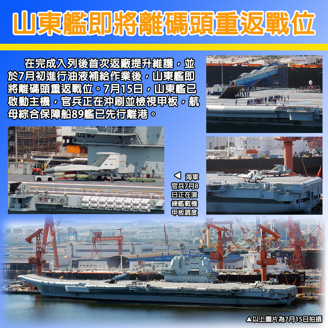 大公文匯全媒體報道,在完成入列後首次返廠提升維護,並於7月初進行油液補給作業後,山東艦即將離開碼頭重返戰位。今日(7月15日),山東艦已啟動主機,官兵正在沖刷並檢視甲板,航母綜合保障船89艦已先行離開港口。