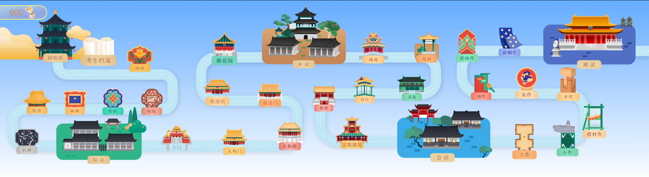 在答題板塊裏,從「初出茅廬」到「殿試奪魁」,30個關卡、850餘個古建知識問答,供線上觀眾邊學邊記錄。通過每個關卡均可收集成就徽章。「殿試」通過後,還可與其他線上觀眾同台競技,一較高下。