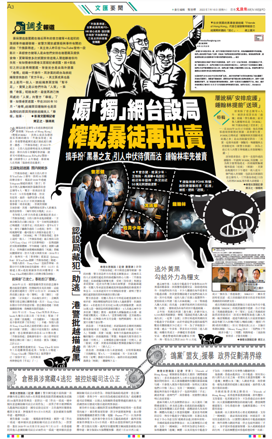 【香港文匯報記者齊正之、張得民】棄保潛逃後匿藏在港近兩年的曾志健等4名逃犯的落網事件繼續發酵。被警方國安處懷疑與事件有關的網台「升旗易得道」,其主持人昨日在YouTube發布一段影片,承認曾志健等人是由他們安排在港匿藏及提供食物,更聲稱曾多次試圖安排這幾人潛逃離港但均失敗。有知情者向香港文匯報記者透露,該4個逃犯之所以能長期匿藏,背後完全是由海外援暴「港獨」組織一手操作,而涉案的網台為該組織發放信息的「官方平台」,其主要成員也基本上是同一批人。該組織表面宣稱「幫手足」,實質上是以他們作為「人質」,乘機「眾籌」呃錢自肥,最後再將已無用處的「人質」向警方「舉報」了事。知情者更透露,早在2020年10月,「港獨」組織頭目鍾翰林也是因為類似的原因而被該組織找人「舉報」拋棄。