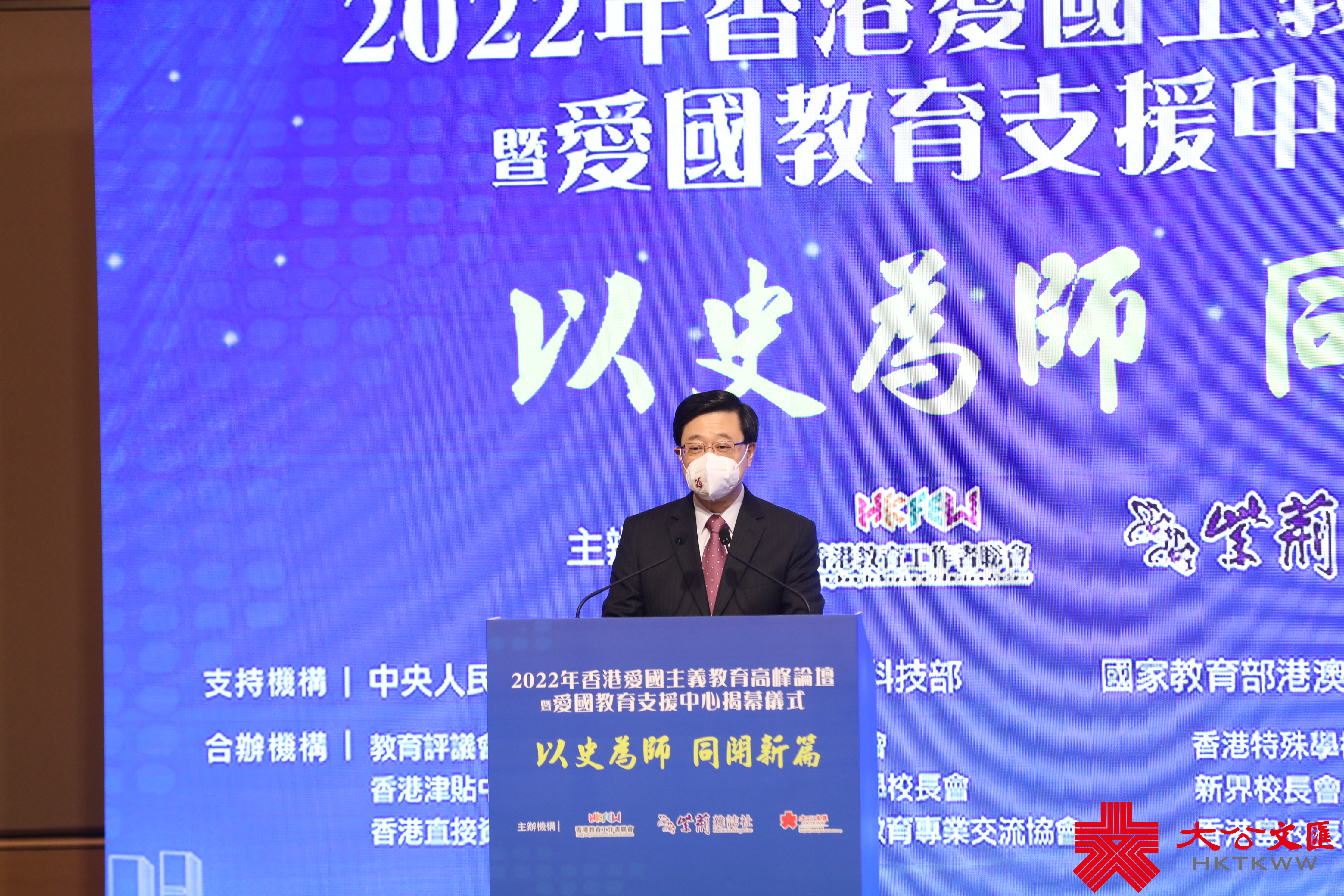 大公文匯全媒體報道,為提升青少年的國家意識和愛國精神,香港教育工作者聯會 、香港大公文匯傳媒集團和紫荊雜誌社聯合主辦「2022年香港愛國主義教育高峰論壇暨愛國教育支援中心揭幕儀式」,今日(16日)上午在香港會議展覽中心舉行。主禮嘉賓行政長官李家超致辭時指出,過去有人刻意誤導青少年,把國民教育污名化,特區政府會推展愛國主義教育,培養國民身份認同。