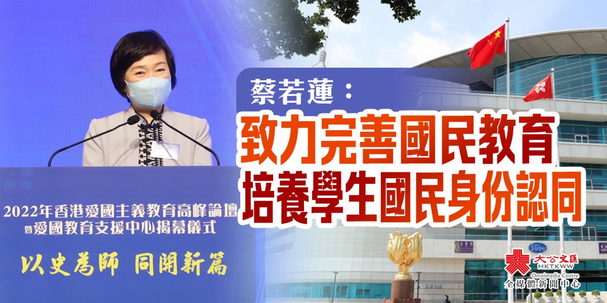 大公文匯全媒體報道,為提升青少年的國家意識和愛國精神,香港教育工作者聯會 、香港大公文匯傳媒集團和紫荊雜誌社聯合主辦「2022年香港愛國主義教育高峰論壇暨愛國教育支援中心揭幕儀式」,今日(16日)上午在香港會議展覽中心舉行。教育局局長蔡若蓮出席論壇時表示,教育局在推動國民教育及國家安全教育一直不遺餘力,未來將致力完善國民教育,培養學生國家情懷、國民身份認同及勇於承擔的品質。