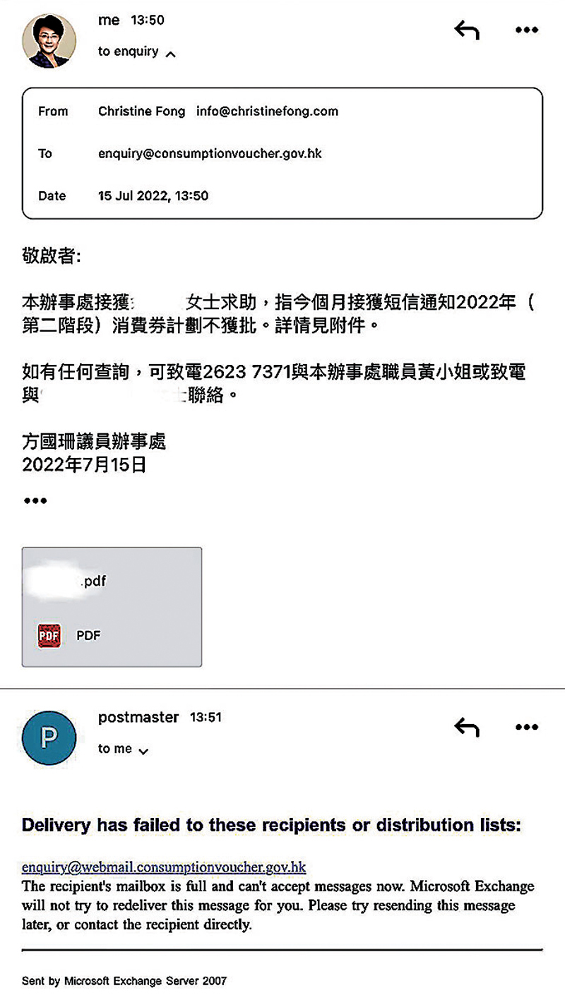 方國珊表示,求助的市民來自全港各區,其中不少長者都不諳電子網絡系統,或打不通消費券計劃秘書處的查詢熱線。在協助市民申訴的過程中,她發現電郵及傳真兩種方式都「大塞車」,此路不通,「有部分求助市民冇電子郵箱,我就通過辦事處郵箱幫佢提交表格同資料,但係我哋郵箱即刻彈出『發送失敗』指示,系統解釋係收件人郵箱已爆滿,無法接收信息。」