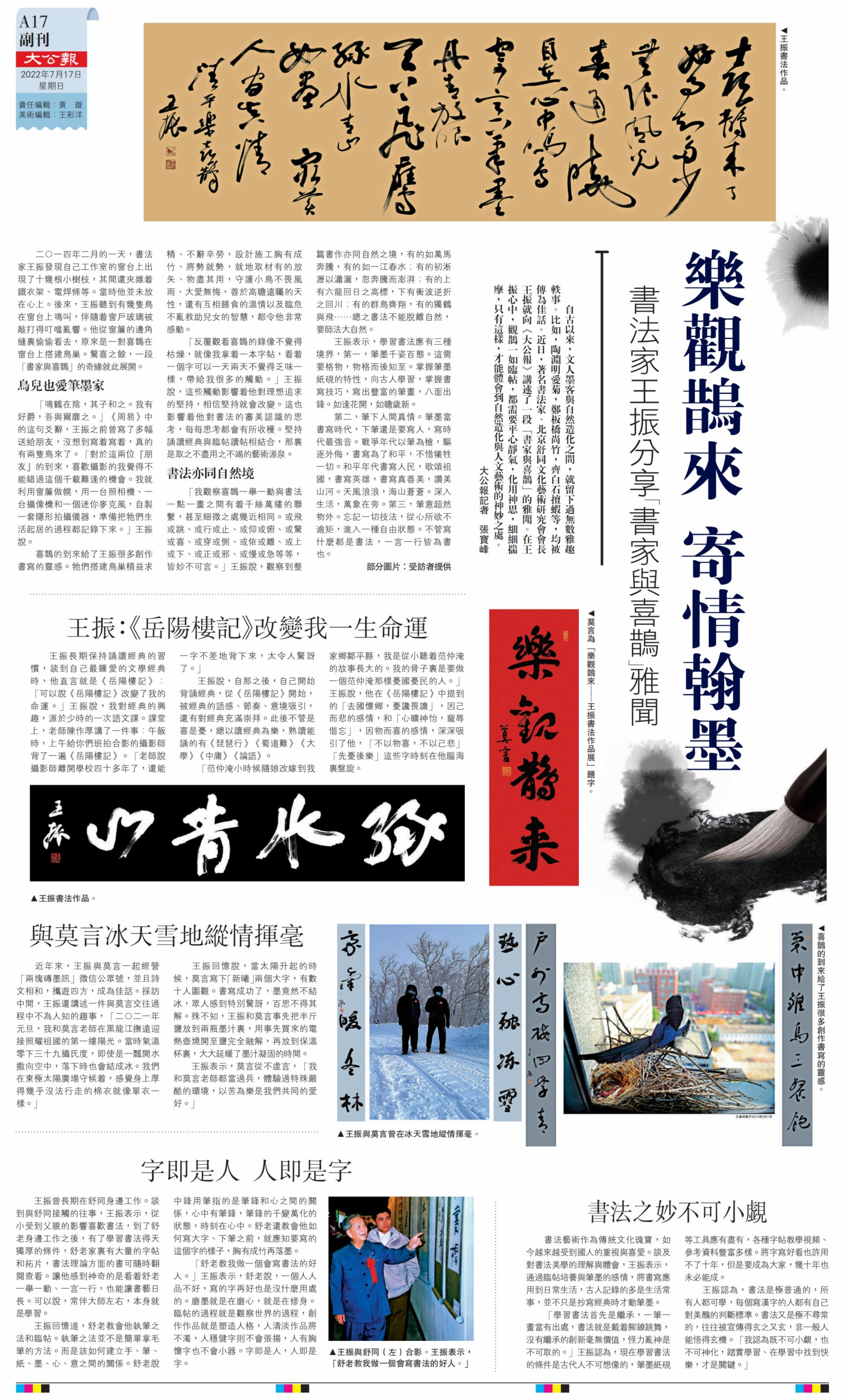 (大公報 記者 張寶峰)自古以來,文人墨客與自然造化之間,就留下過無數雅趣軼事。比如,陶淵明愛菊,鄭板橋尚竹,齊白石擅蝦等,均被傳為佳話。近日,著名書法家、北京舒同文化藝術研究會會長王振就向《大公報》講述了一段「書家與喜鵲」的雅聞。在王振心中,觀鵲一如臨帖,都需要平心靜氣,化用神思,細細揣摩,只有這樣,才能體會到自然造化與人文藝術的神妙之處。